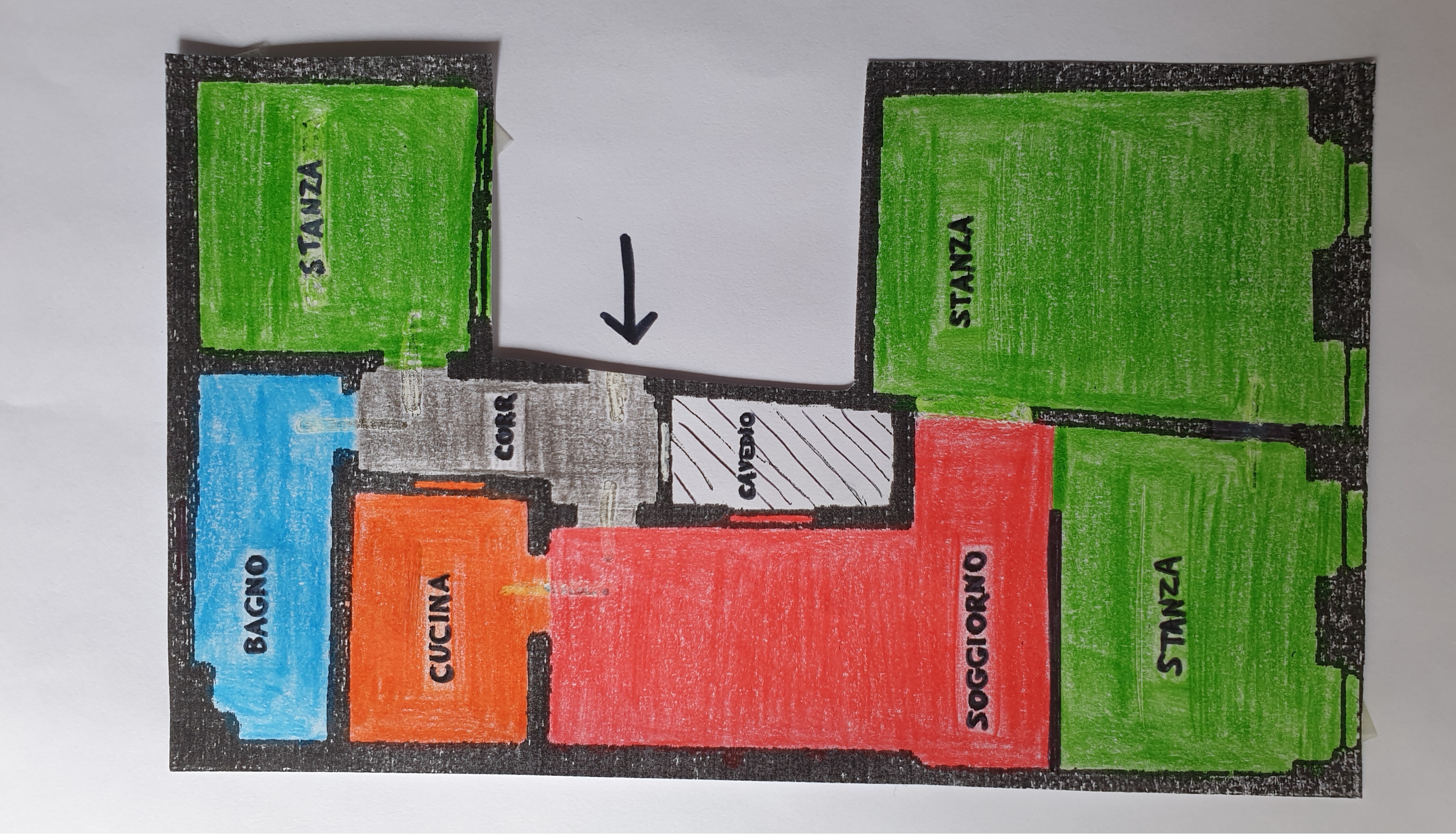 MAPPA PIANTA dell'APPARTAMENTO I "colori" dell'appartamento: ---->: porta di ingresso grigio: ingresso verde: stanza rosso: soggiorno arancione: angolo cottura azzurro: bagno